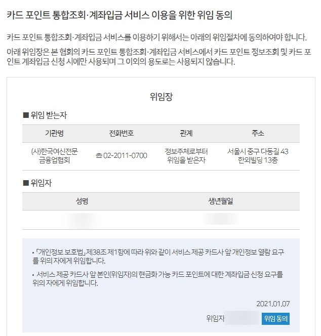 다음은 조금 거부감 있게 생긴 위임장 동의 팝업이 표시됩니다 여신금융협회에서 전체 카드사 대상으로 저대신 위임해서 신용카드 포인트를 조회하고 계좌입금까지 하는 것이기에 위임 동의는 필요한 것이 사실입니다