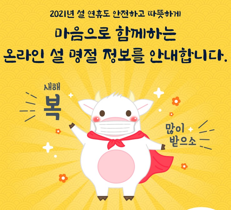 특히 2021년 설 연휴는 코로나 때문에 고향을 방문하지 못하는 분들이 많으실 텐데요 고향에 가지 못하는 아쉬운 마음을 달래 드리고자 다양한 온라인 공연, 영상, 전시, 체험 등을 무료로 제공한다고 합니다