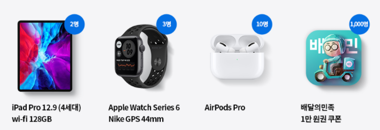 또한 아이폰12 출시 이벤트로 추첨을 통해 아이패드 프로12.9(4세대)와 애플워치6, 에어팟프로, 배달의 민족 만원쿠폰 등 푸짐한 상품이 준비되어 있습니다