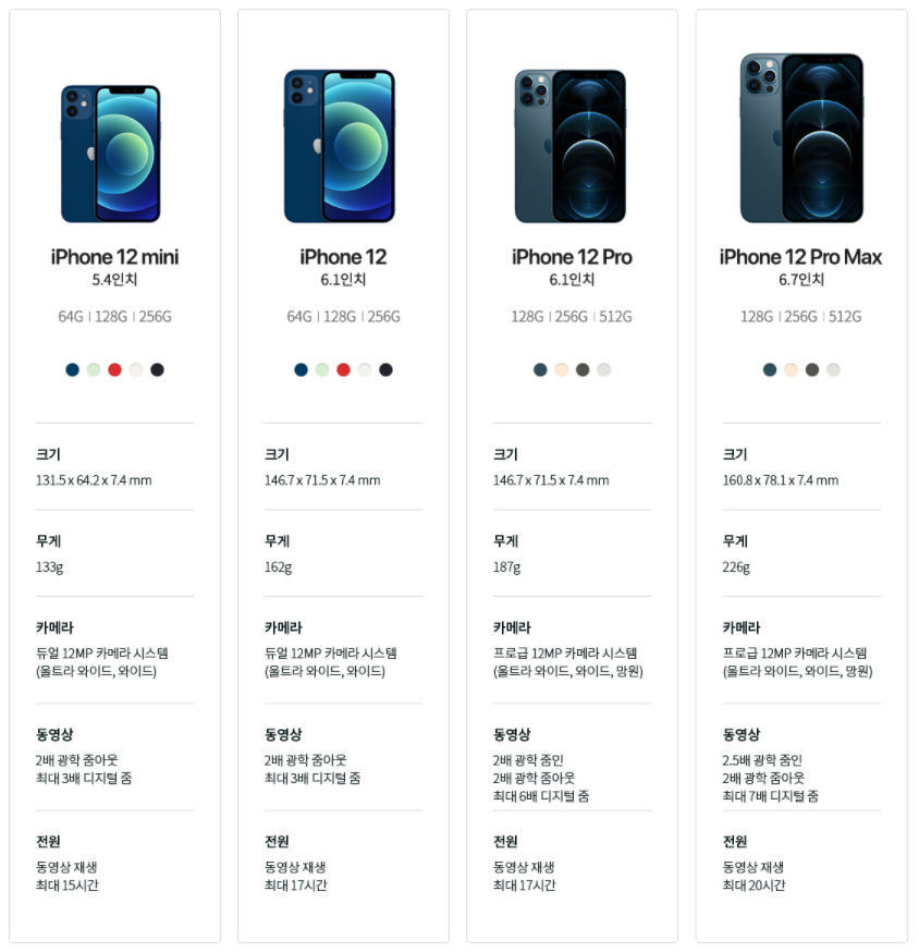 아이폰12 모델별 스펙 가격 비교하시고 본인에게 맞는 아이폰12를 구매하시면 좋을것 같습니다