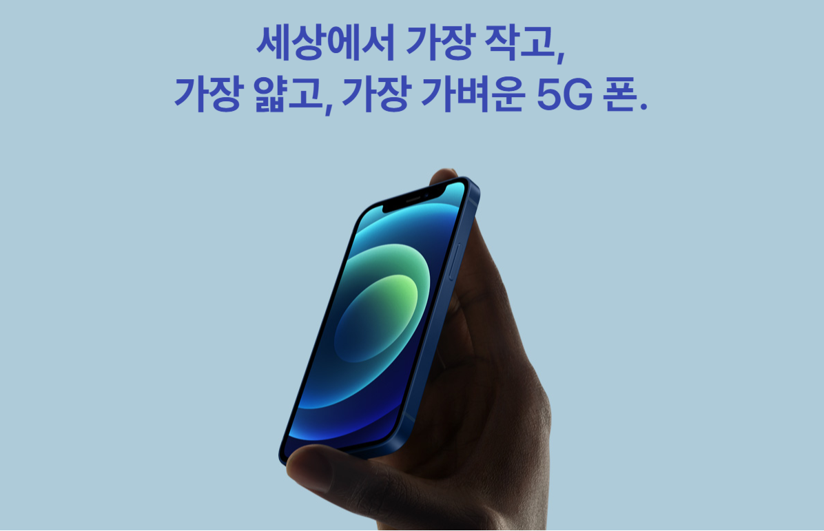 세상에서 가장작고, 가장 얇고, 가장 가벼운 5G폰이라는 모토로 아이폰 최초 5G모델입니다