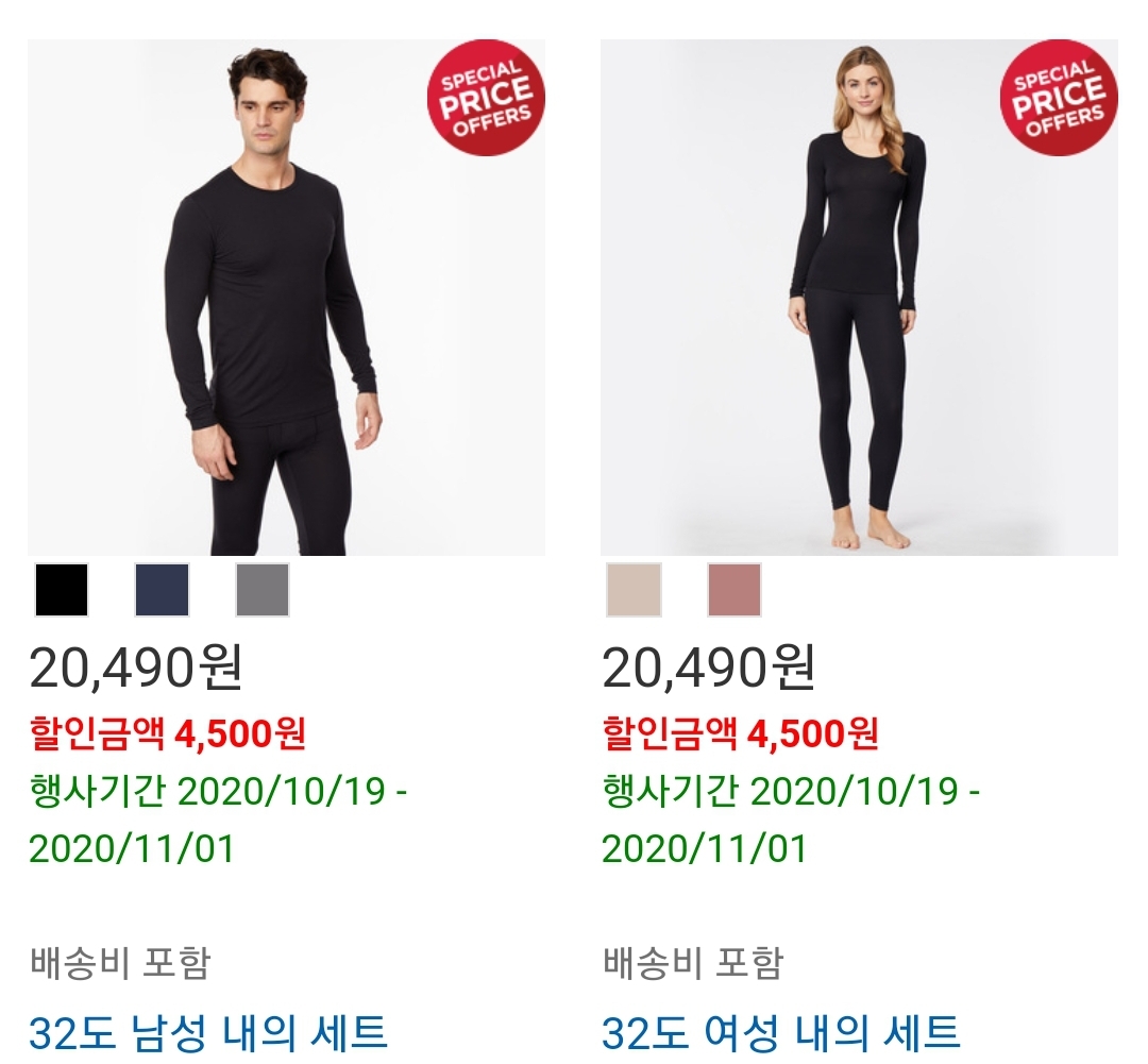 계절에 맞게 내의와 외투 위주의 할인 품목으로 구성되어 있습니다