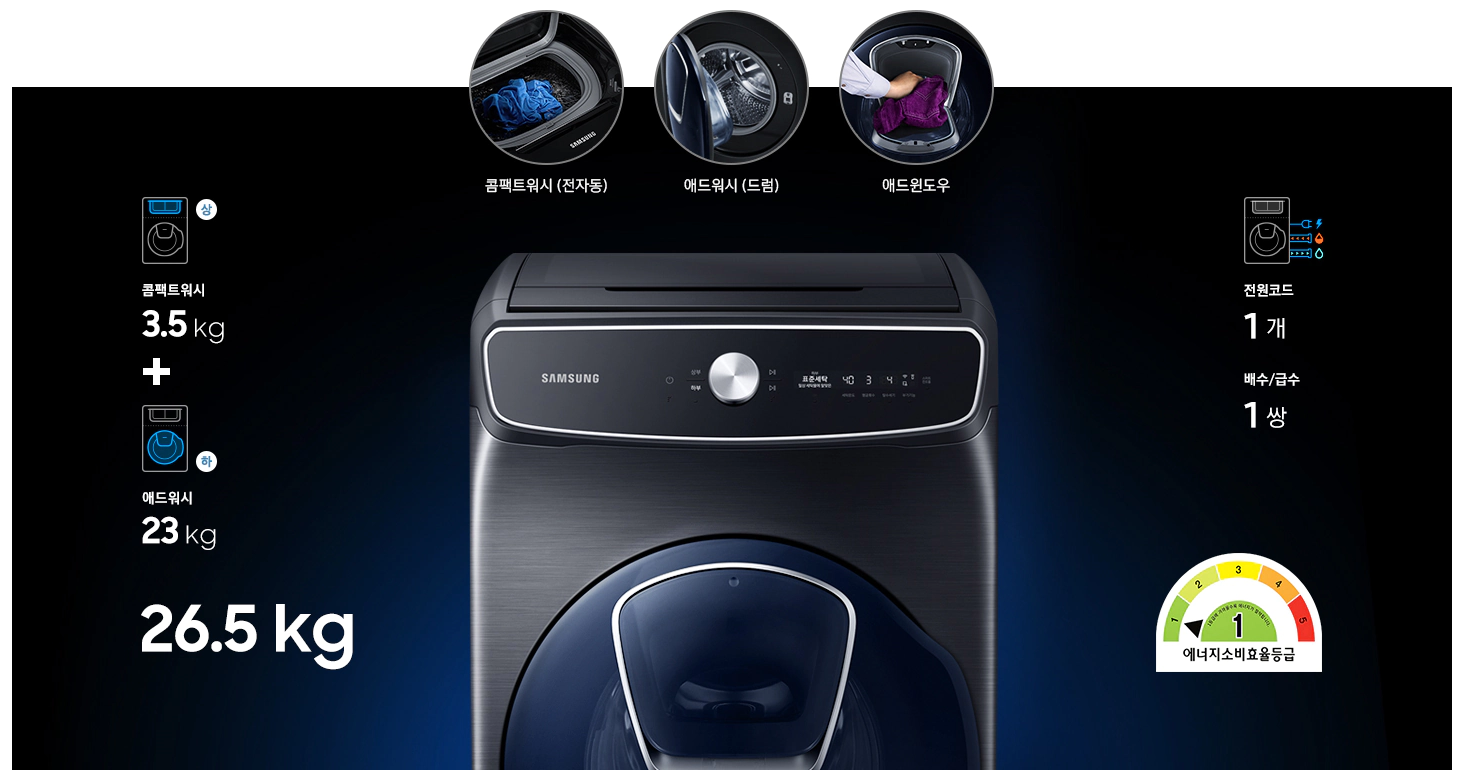 애드워시 기능이 인기를 많이 끌었었는데요 콤팩트워시 기능이 추가되어 세탁기에서 필요한 기능은 다 넣은듯 합니다 에너지 효율도 1등급이라 전기세 걱정도 없을것 같습니다
