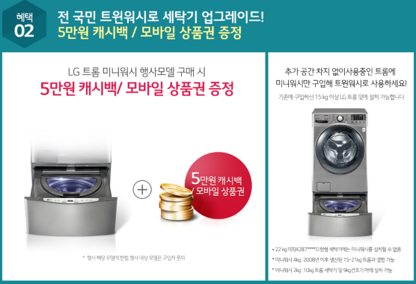 기존 트롬 LG 세탁기를 보유하시는 분들께서 LG 트롬 미니워시 행사모델 구매시 5만원 캐시백과 모바일 상품권을 드립니다