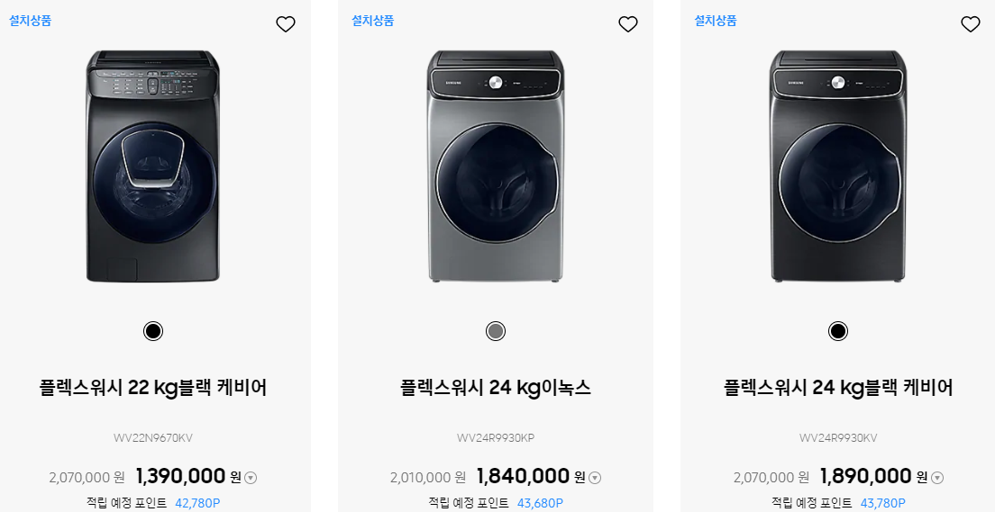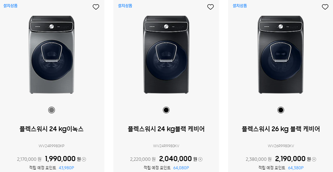 가장 고가의 모델은 26KG 블랙 케비어 색상의 플렉스워시 세탁기 입니다 219만원이네요
