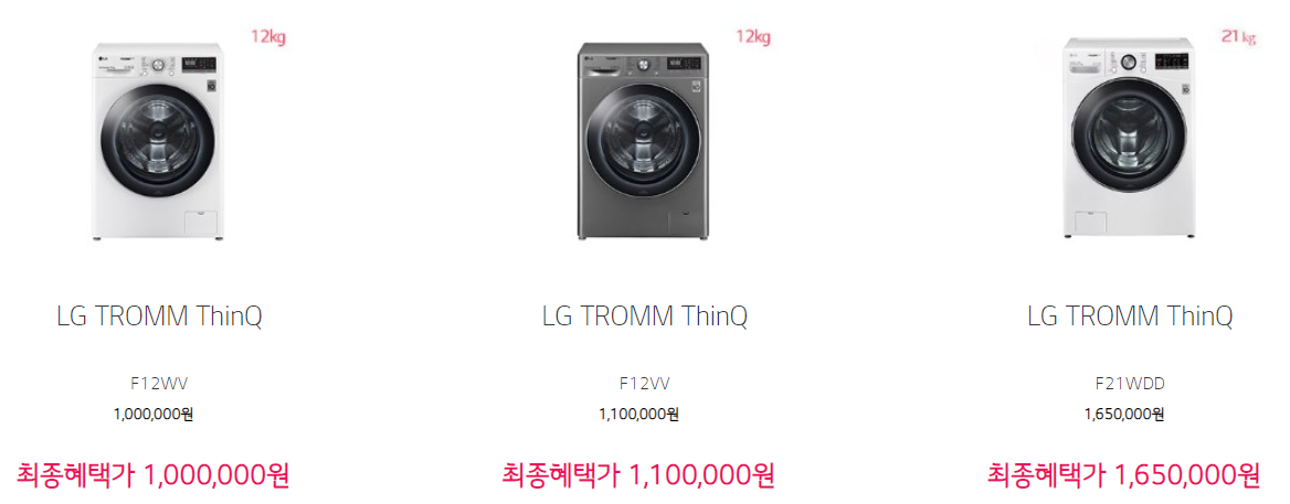 우선 LG 트롬 세탁기 가격비교는 낮은 가격순으로 소개시켜드리도록 하겠습니다 가장 저렴한 모델은 100만원 부터 시작하는걸 볼 수 있습니다 12KG이면 용량도 나쁘지 않은것 같습니다