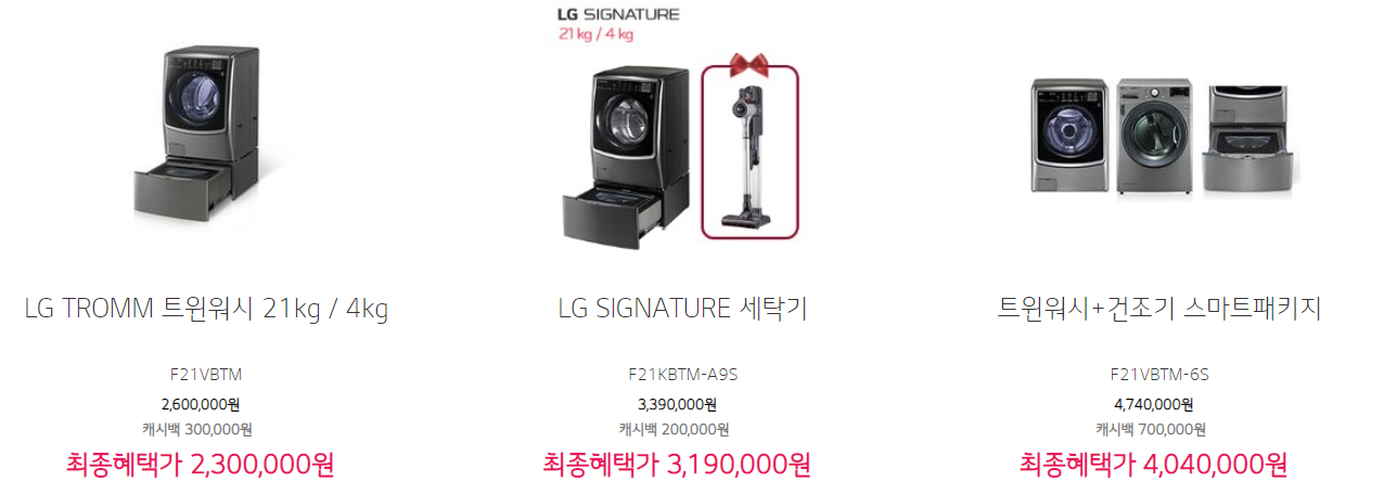 LG 트롬 트윈워시 21KG / 4KG 모델입니다 소비자가 260만원이고 현재 30만원 캐시백 행사중이네요