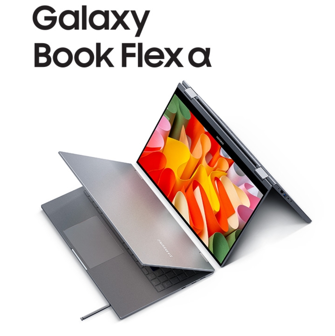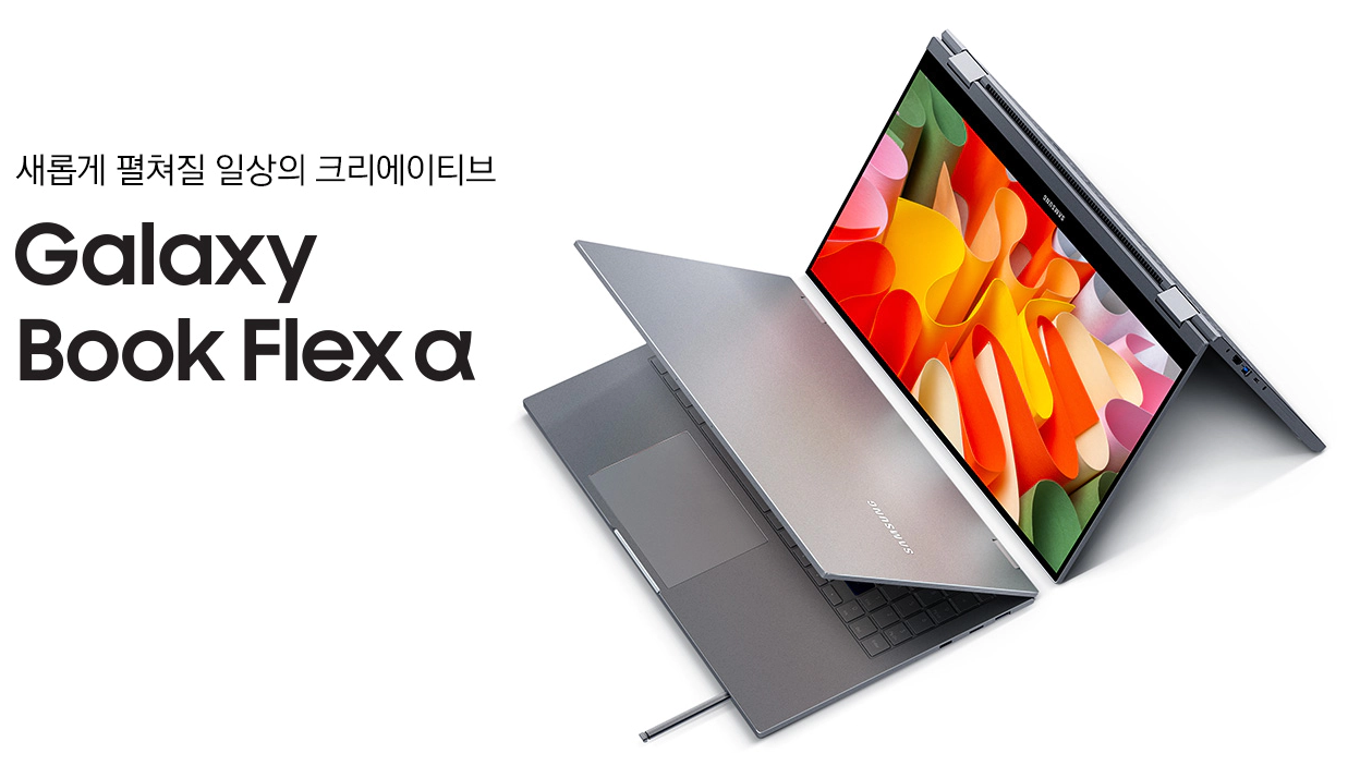 삼성노트북 갤럭시북 플렉스 알파 입니다 이름이 플렉스 알파이다 보니 갤럭시북 플렉시 보다 더 고사양의 노트북이라고 오해하실수 있는데요 반대로 삼성노트북 갤럭시북 플렉스 보급형 모델이라고 보시면 됩니다