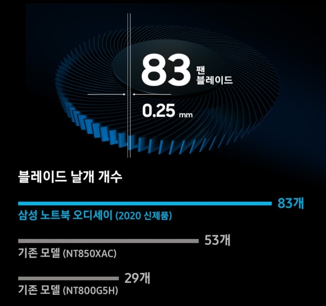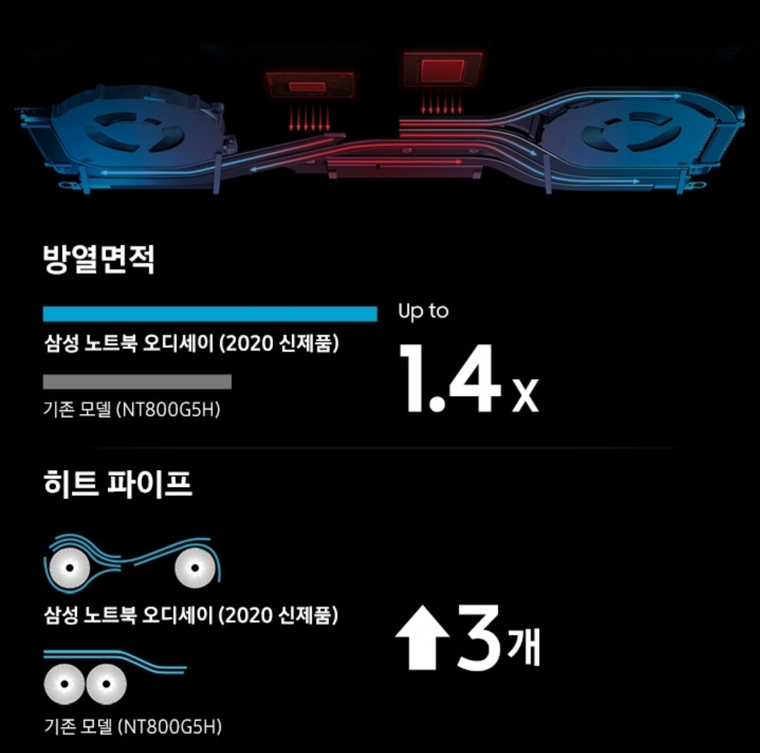 히트파이프개수가 기존모델보다 2개에서 5개로 3개가 늘어나고 방열 면적도 최대 40프로 이상 증가되었습니다