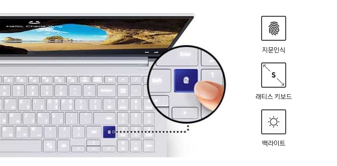 삼성노트북 갤럭시북 이온에도 지문인식 센서와 래티스 키보드가 적용되어있습니다