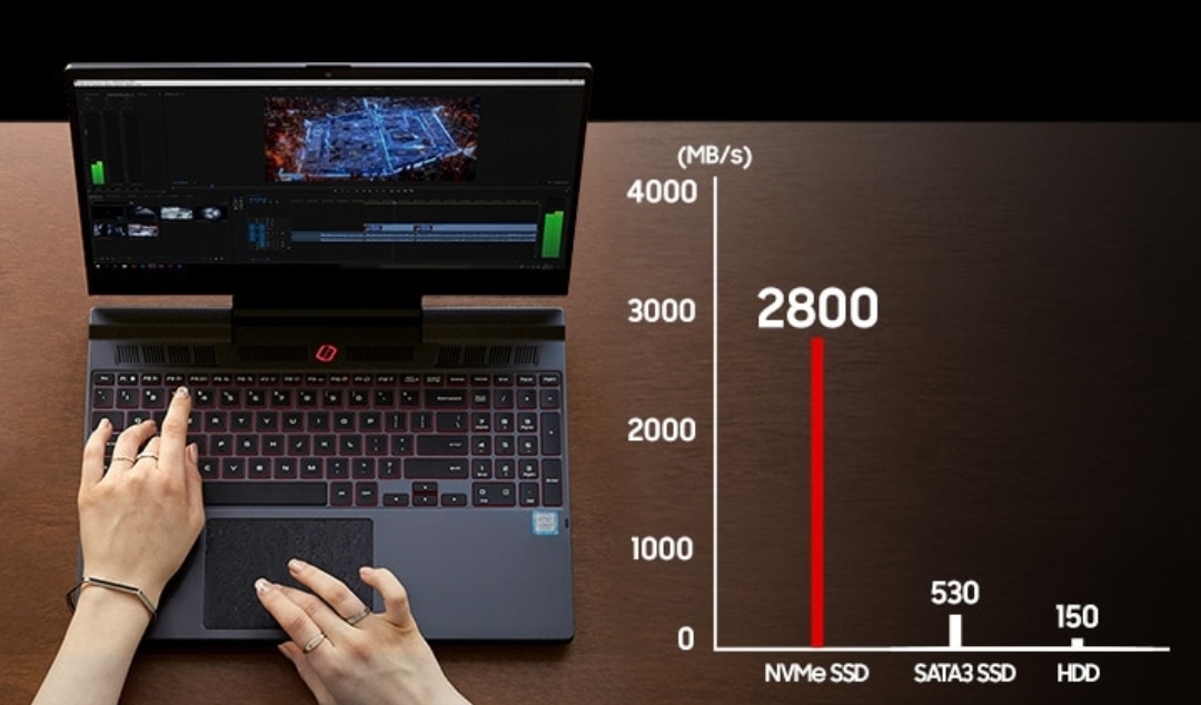 삼성 게이밍 노트북 오디세이에는 일반적인 SATA3방식의 SSD보다 최대 5배빠른 속도를 자랑하는 NVMe SSD가 탑재되어 있습니다
