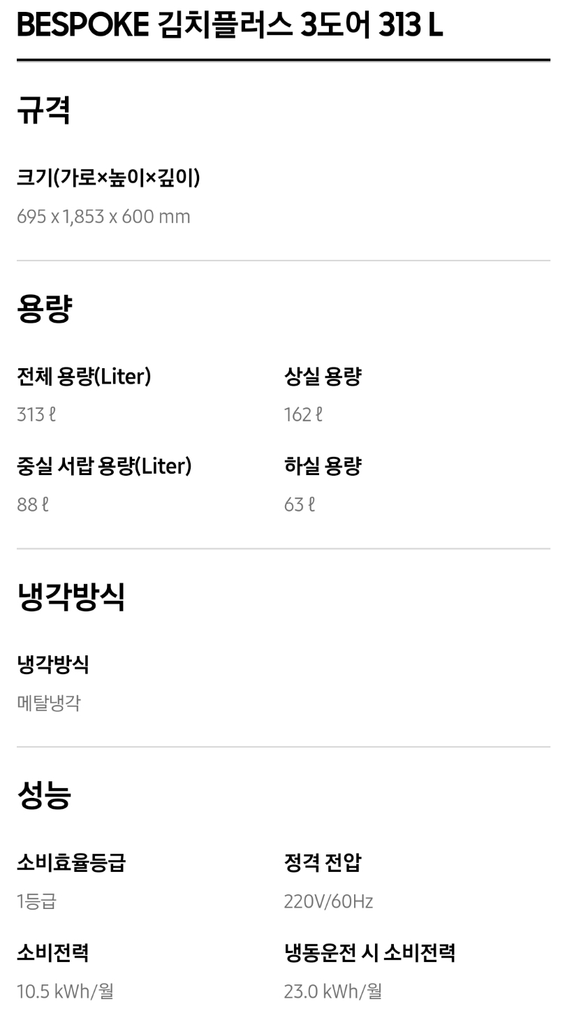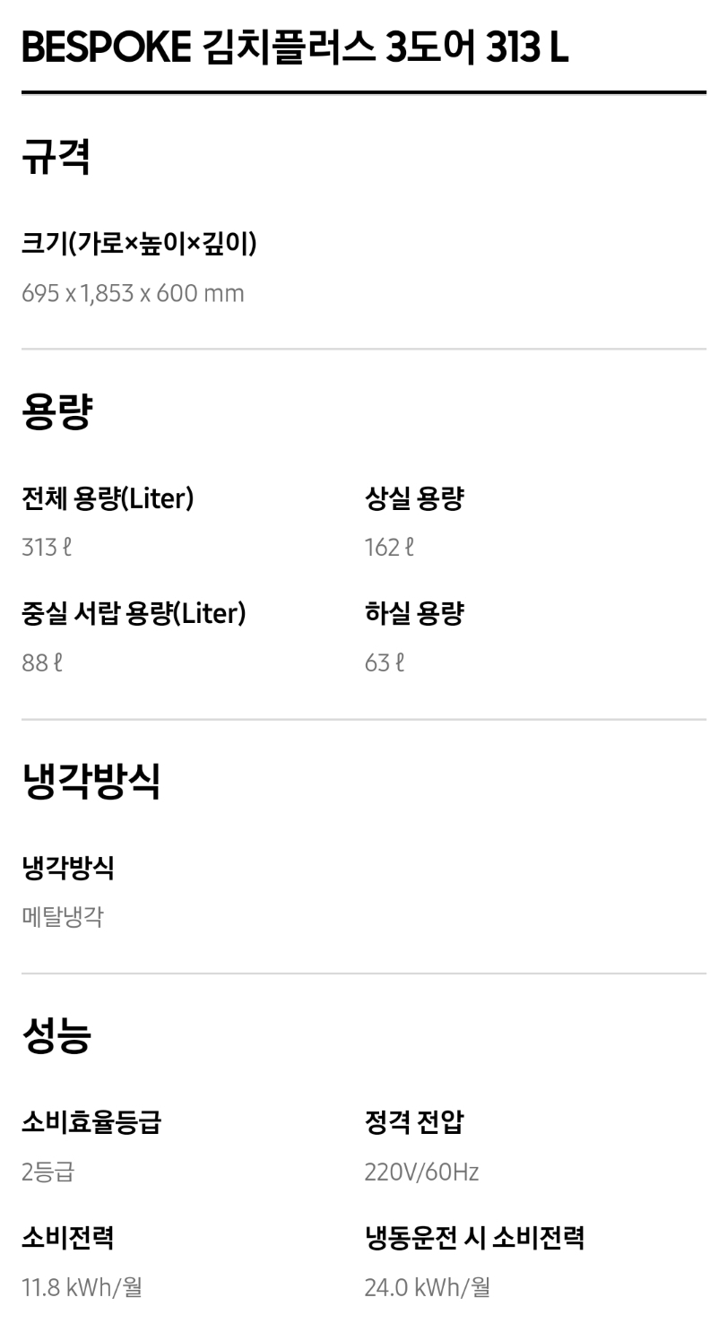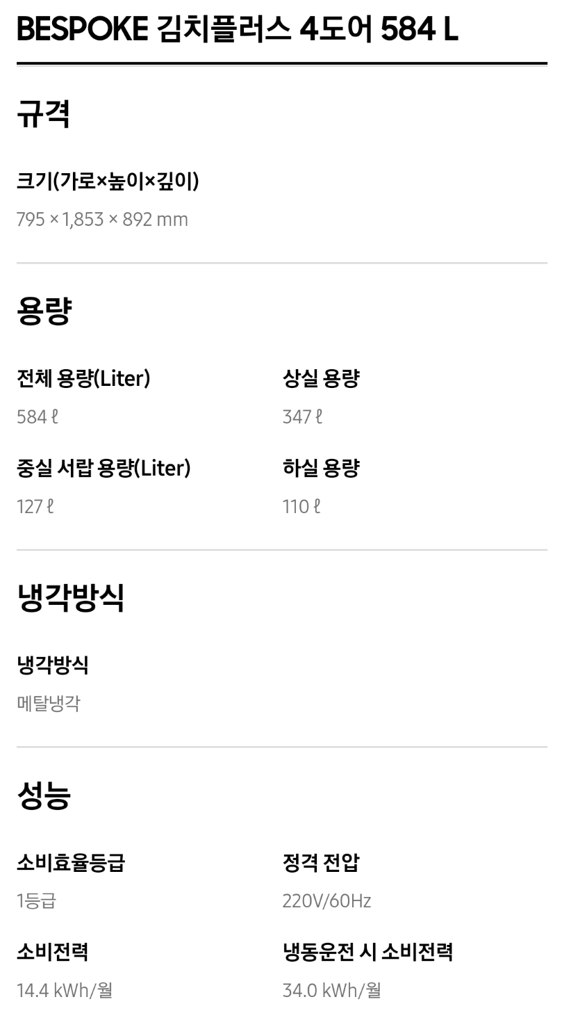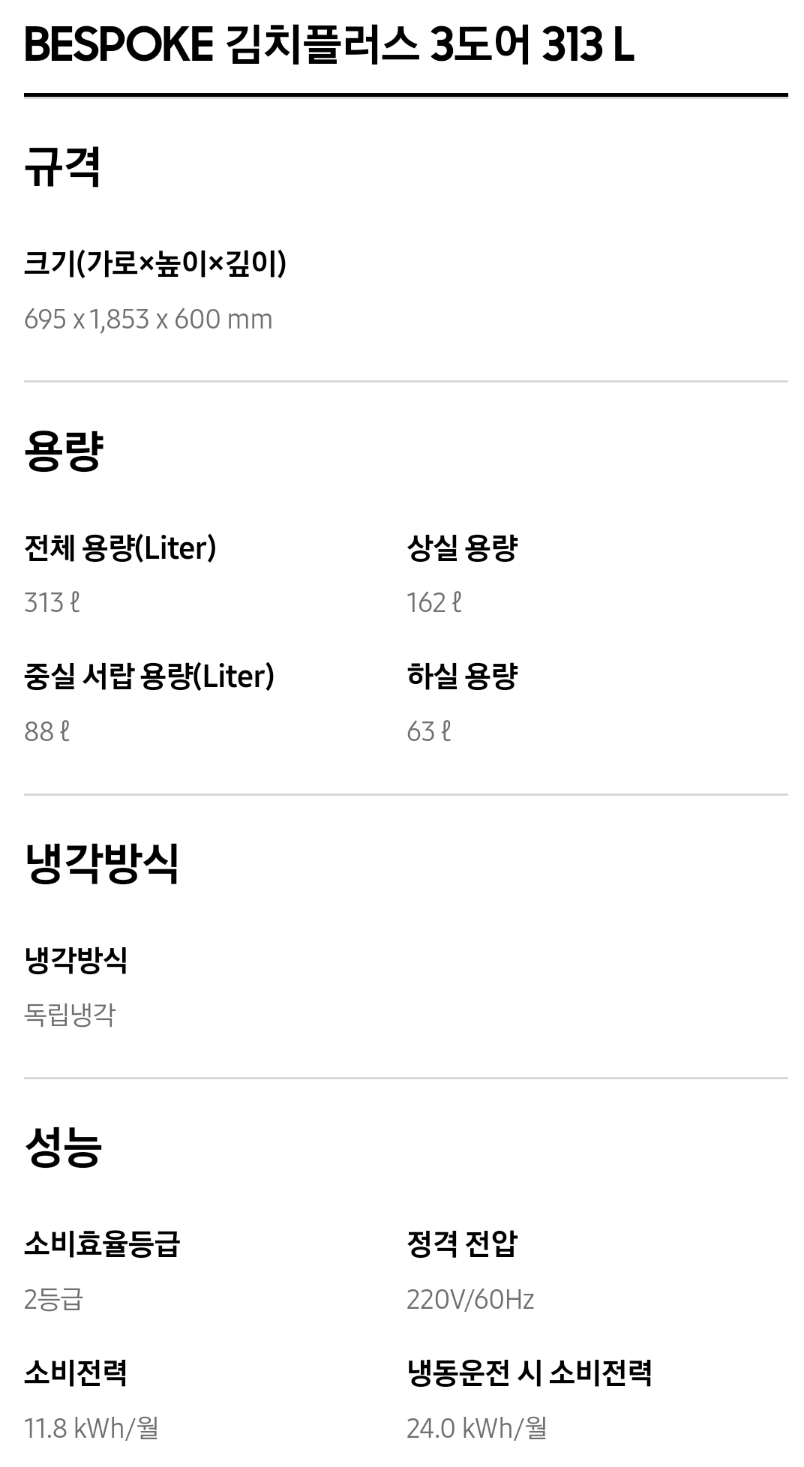 1. 삼성 김치냉장고 스탠드형 비스포크 주요성능 및 가격비교