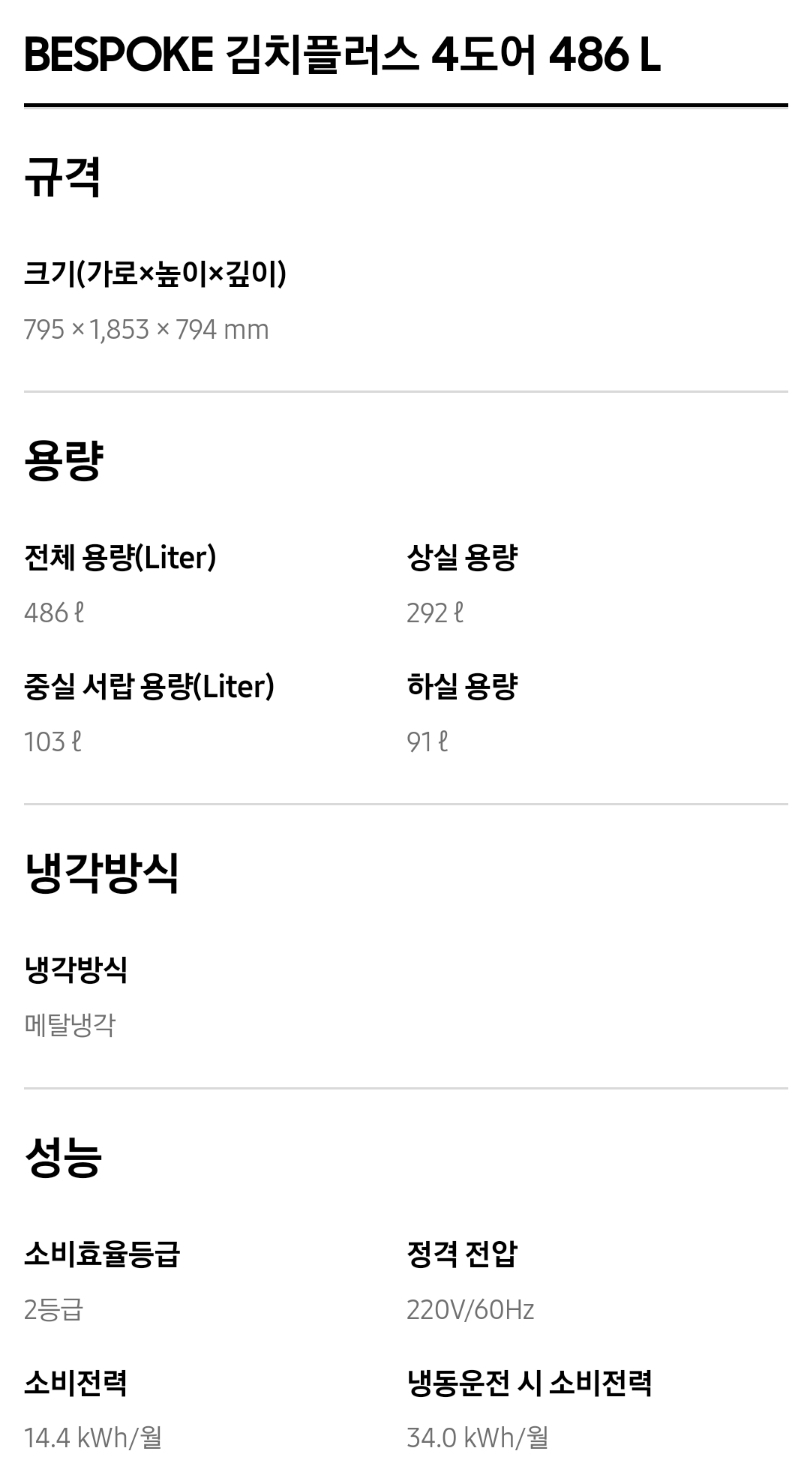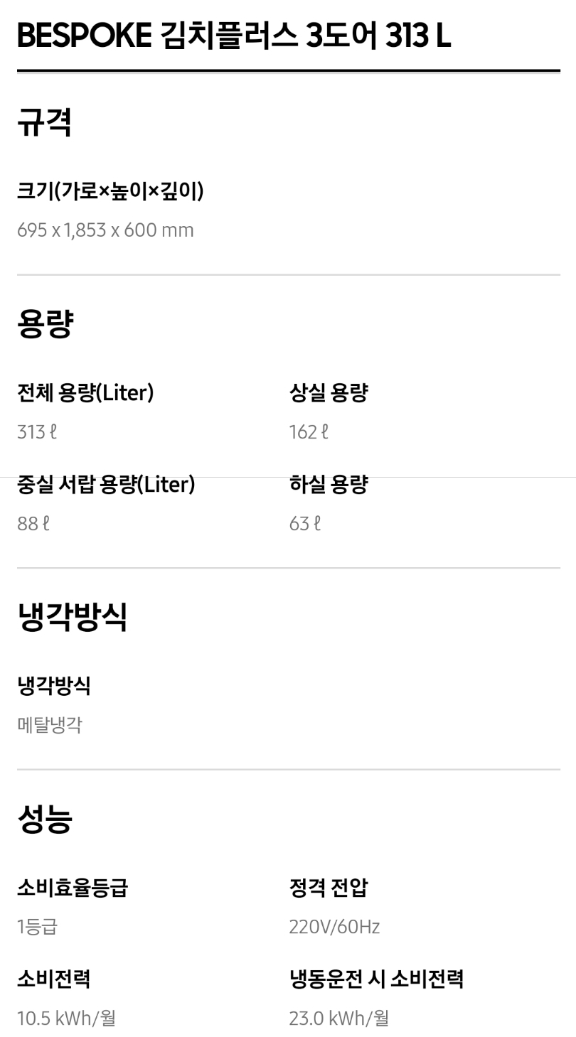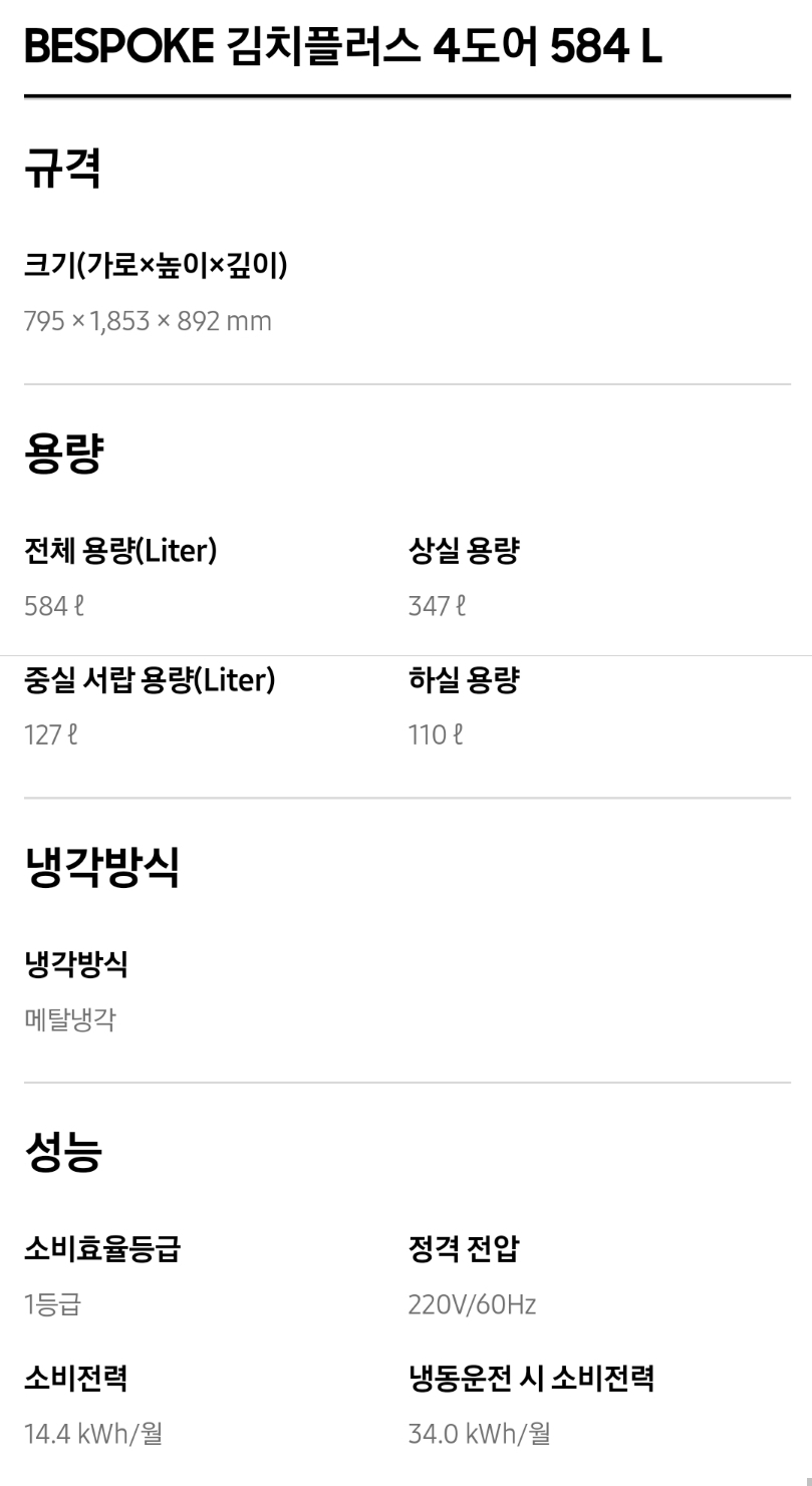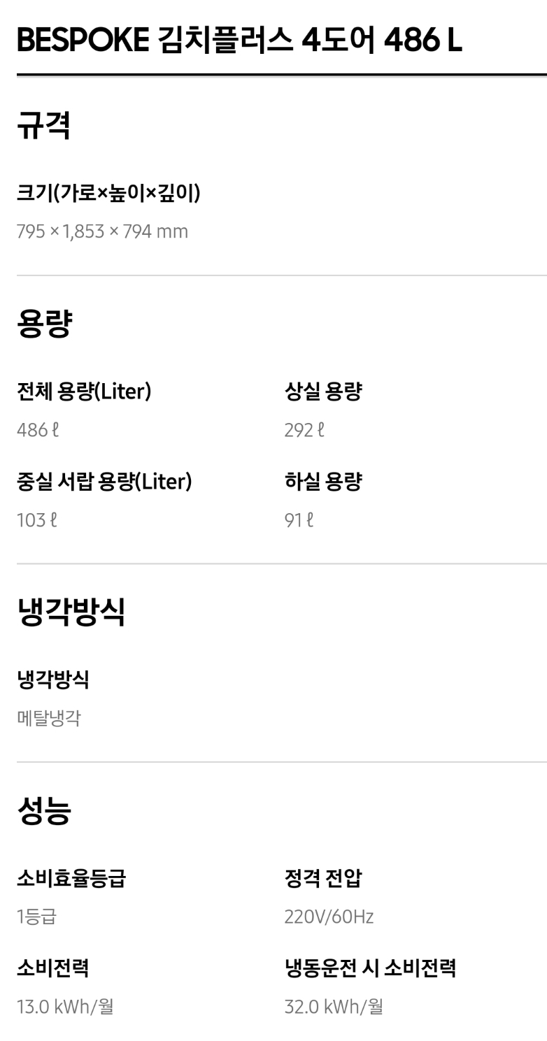 1. 삼성 김치냉장고 스탠드형 비스포크 주요성능 및 가격비교