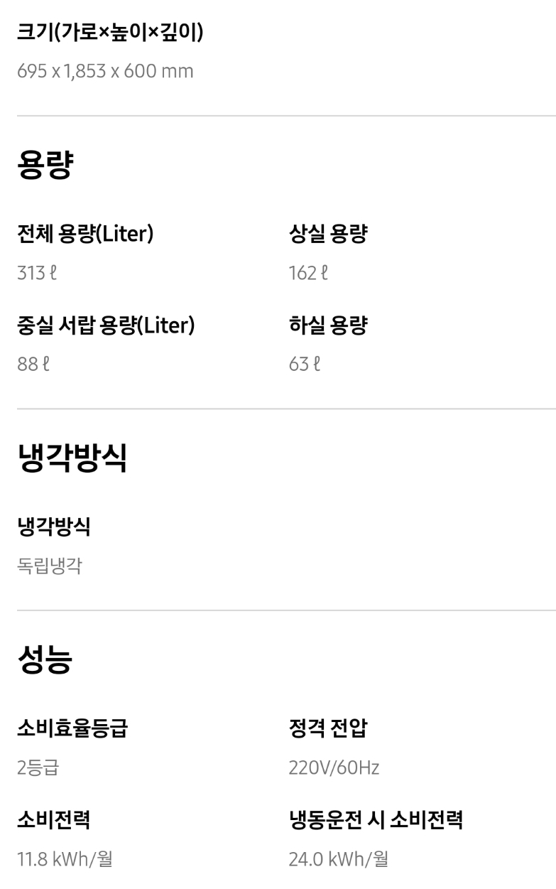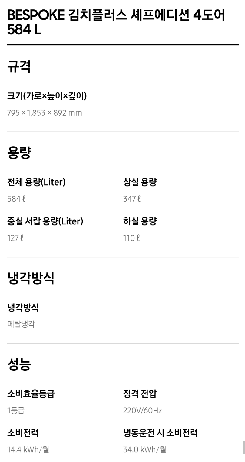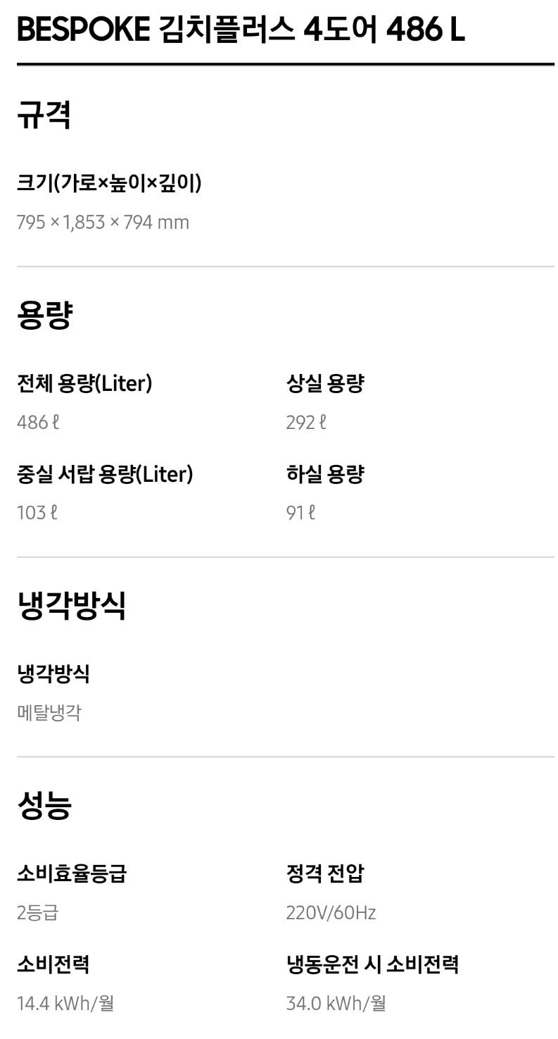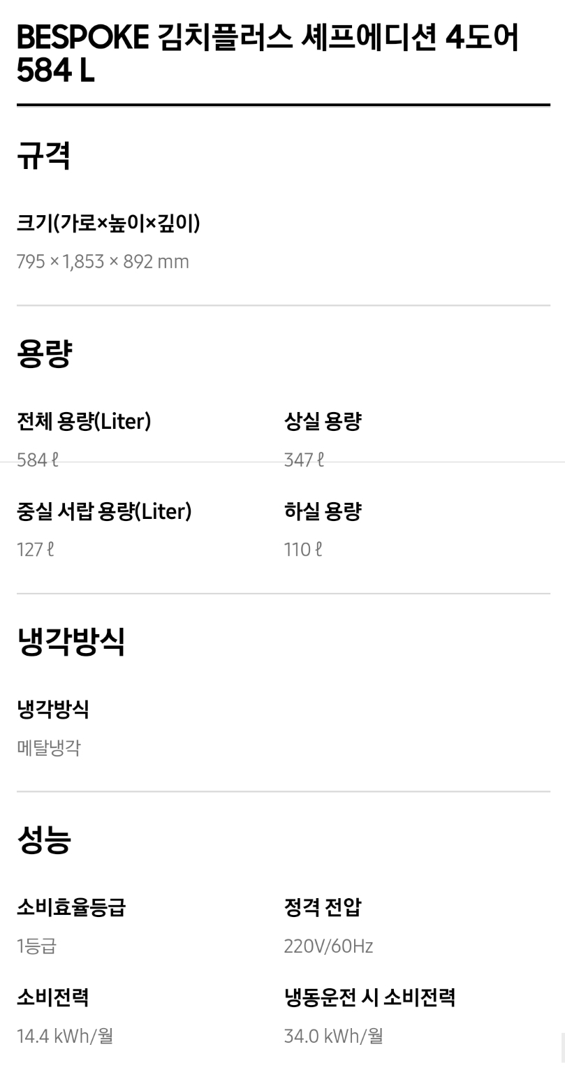 1. 삼성 김치냉장고 스탠드형 비스포크 주요성능 및 가격비교