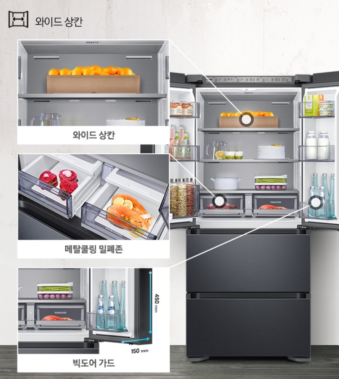 와이드 상칸은 수박은 물론 케이크까지 길이가 길고 큰 제품을 넉넉한 공간으로 쉽게 보관할 수 있습니다 그리고 빅도어 가드에는 생수통 2L도 충분히 보관이 가능합니다