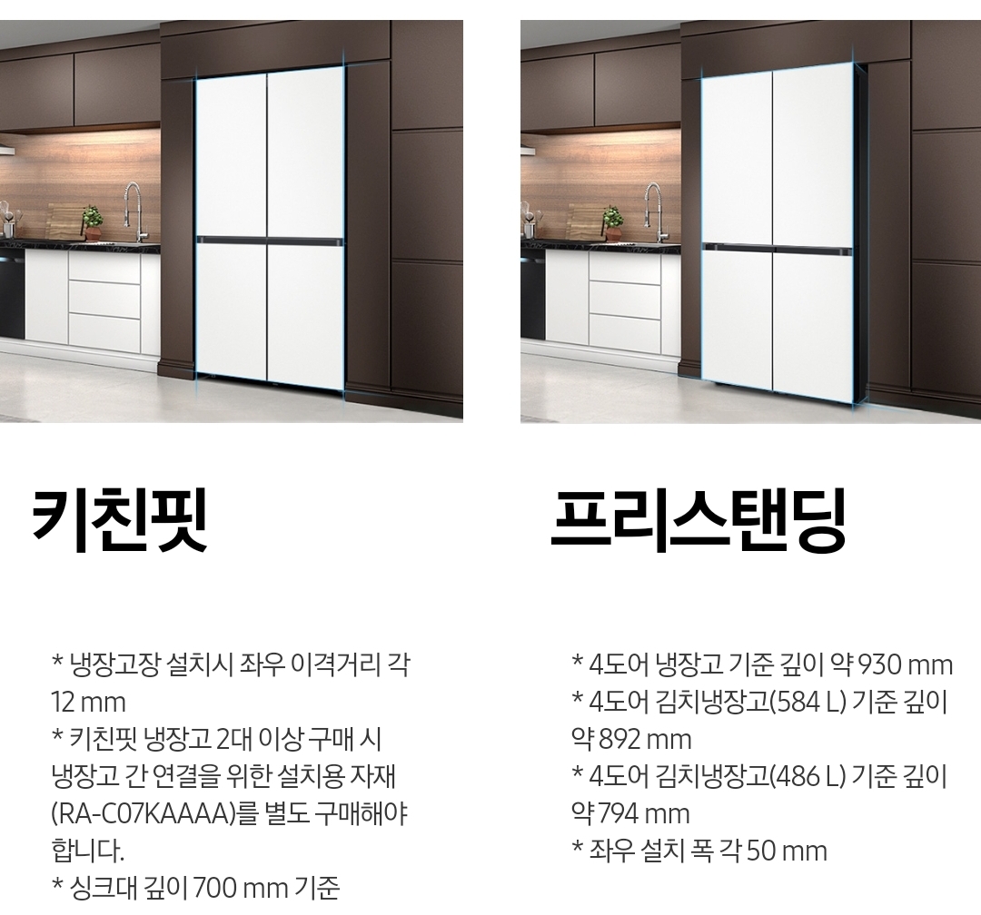 삼성 김치냉장고 스탠드형 비스포크 모델은 내주방에 맞게 설치 타입을 선택할 수 있습니다 키친핏 적용시 마치 빌트인 김치냉장고인 것 같은 느낌을 줄수 있게 됩니다