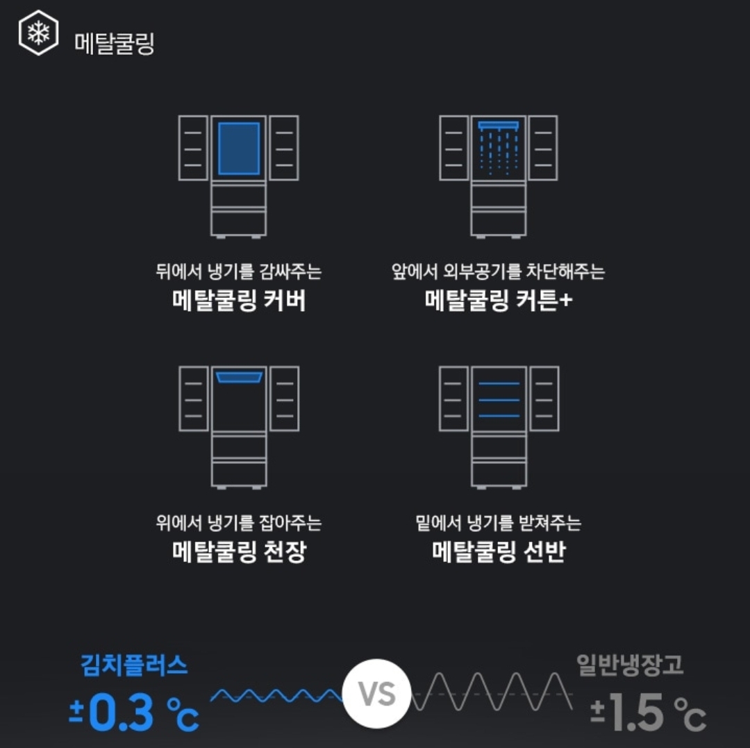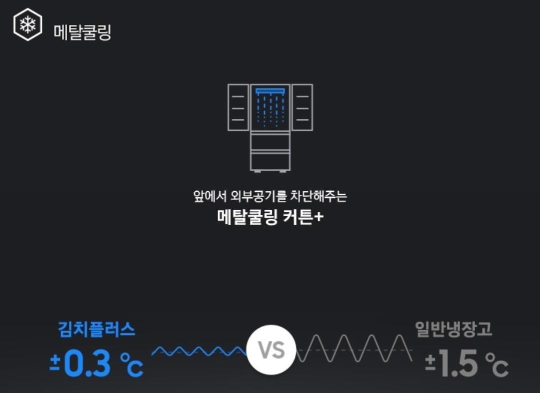 삼성 김치냉장고 스탠드형 비스포크 셰프에디션 모델에는 메탈쿨링이 총 4가지 방식으로 적용되었는데요 김치플러스 모델에는 메탈쿨링 커튼+ 한가지 기능이 적용되어 있습니다