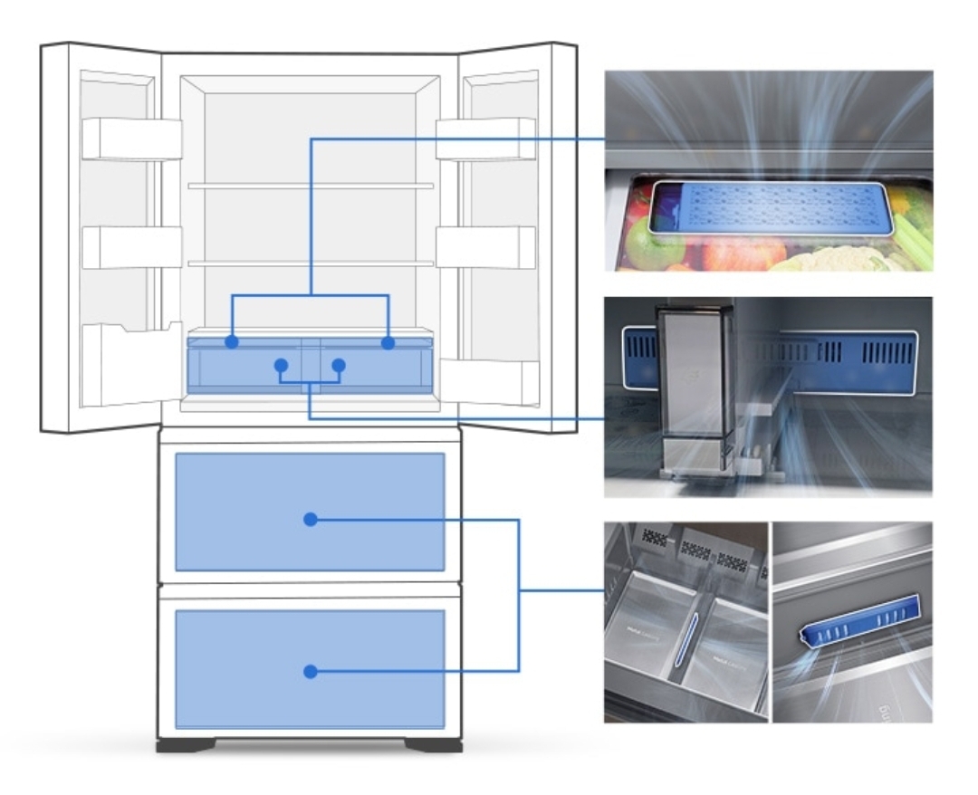 삼성 김치냉장고 스탠드형 제품에는 상칸, 중간, 하칸에 각각 냄새를 잡기위한 프레쉬 필터가 장착되어 있습니다