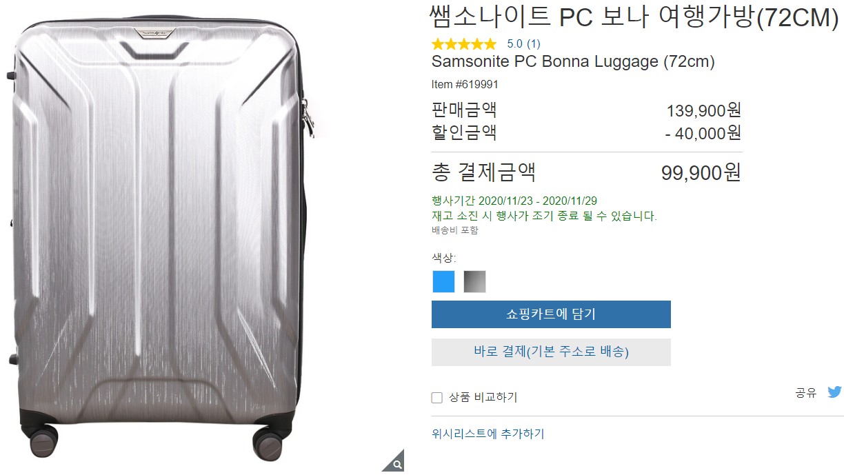 쌤소나이트 캐리어 72CM 제품도 4만원 할인이 적용되어 99,900원에 구입 가능합니다