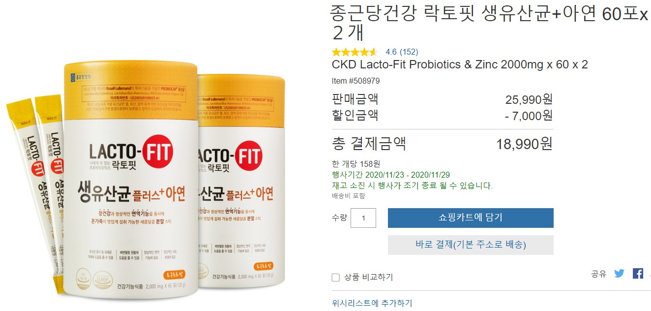 종근당건강 락토핏 생유산균은 코스트코 인기 판매 상품입니다 이번 코스트코 블랙 프라이데이 세일 기간 동안 7000원 할인이 제공됩니다