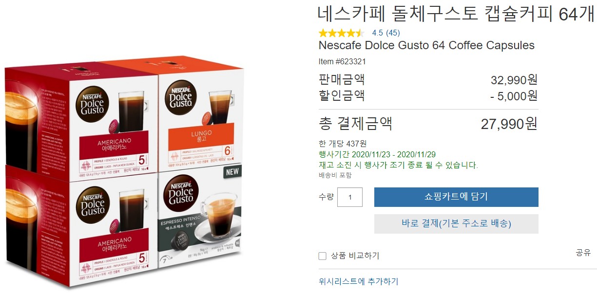 네스카페 돌체구스토 캡슐커피 64개 세트는 5천원 할인행사를 진행합니다