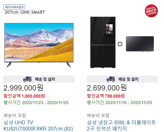 삼성 UHD TV는 100만원 할인이 적용중에 있습니다, 삼성 냉장고와 더플레이트 세트는 70만원 할인이 제공 됩니다