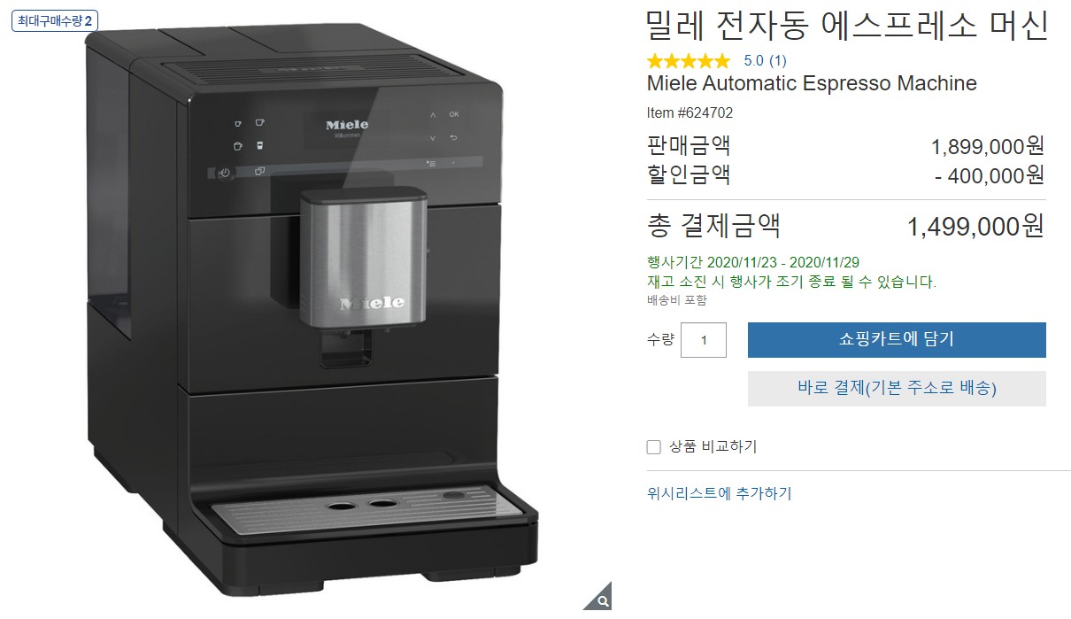 밀레 전자동 에스프레소 커피머신도 이번 블랙프라이데이 할인 상품에 포함되었습니다 40만원 할인에 즉시할인 2만원까지 할인 받을 수 있습니다