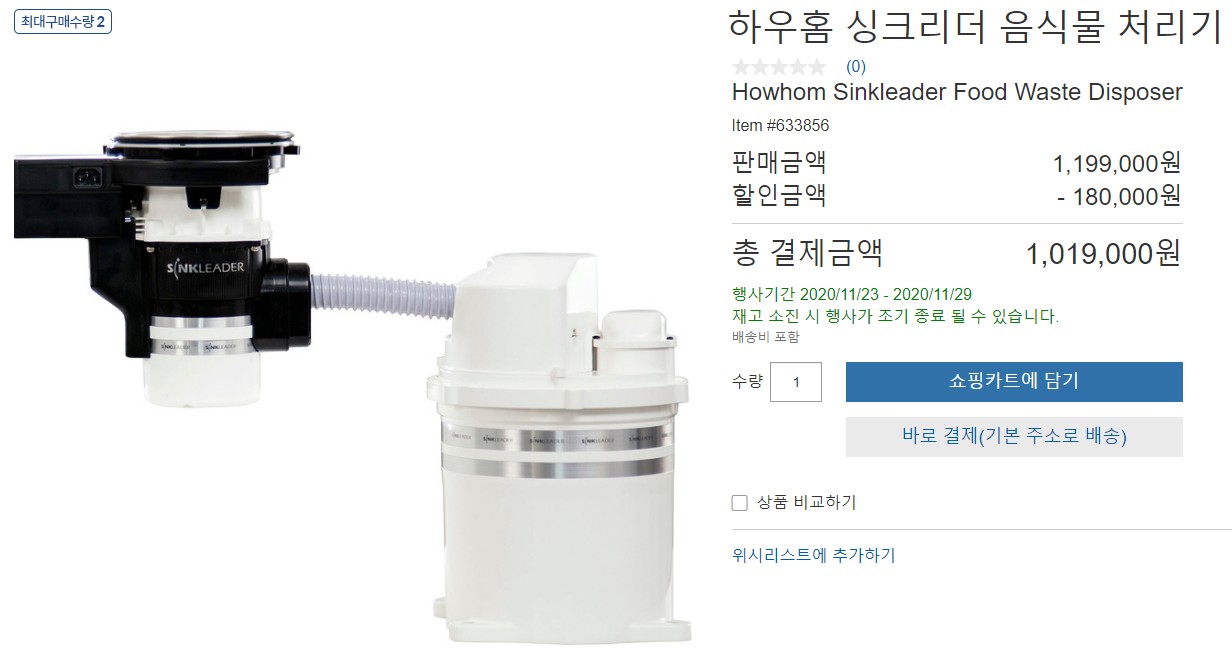 하우홈 싱크리더 음식물 처리기 입니다 코스트코 블랙 프라이데이 할인 18만원 거기에 즉시할인 2만원 총 20만원 할인이 제공됩니다