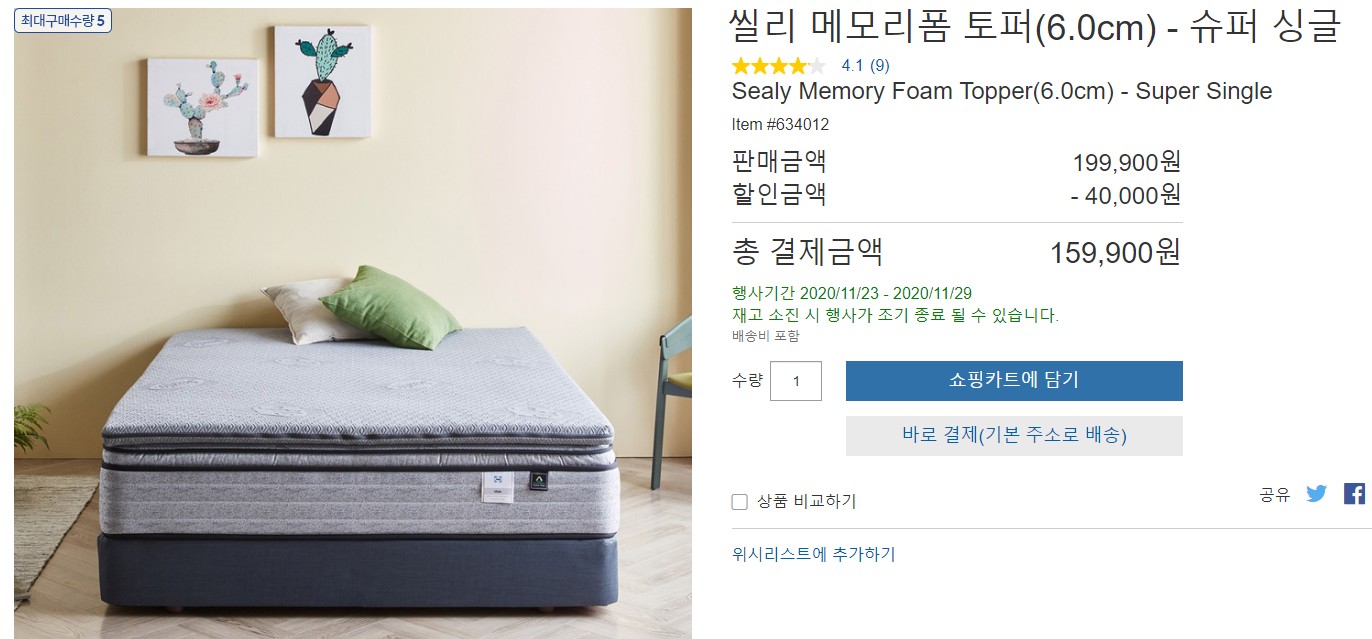 씰리 메모리폼 토퍼 슈퍼 싱글 사이즈 입니다 코스트코 블랙 프라이데이 할인 4만원이 적용됩니다