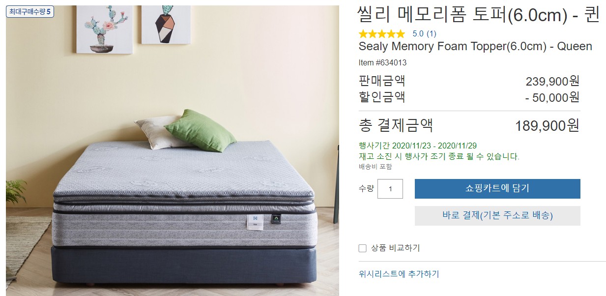 씰리 메모리폼 토퍼 퀸사이즈 입니다 코스트코 블랙 프라이데이 할인 5만원이 적용되고 제품가격이 30만원이 넘지 않아 단독으로 구매시 즉시할인 2만원은 적용되지 않습니다