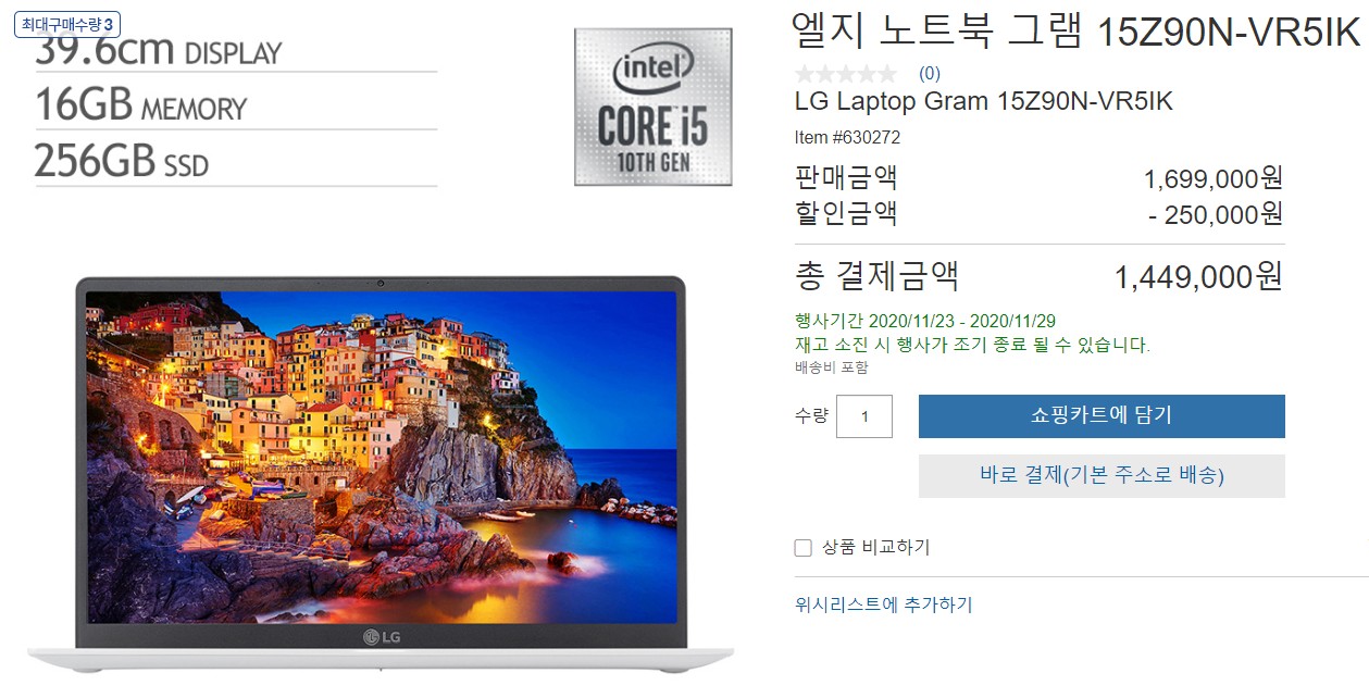 엘지 노트북 그램은 25만원 할인에 즉시할인 2만원 총 27만원 할인 혜택이 제공됩니다