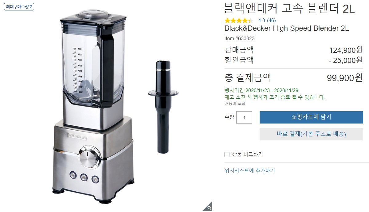 블랙앤데커 고속 블렌더 2L 제품으로 블랙 프라이데이 할인 2만5천원이 제공됩니다