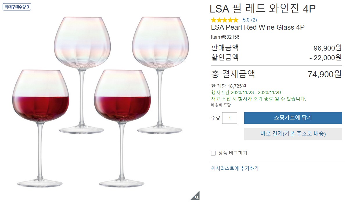 LSA 펄 레드 와인잔 4P 세트 제품은 코스트코 블랙 프라이데이 행사로 22,000원 할인된 가격으로 구매하실수 있습니다