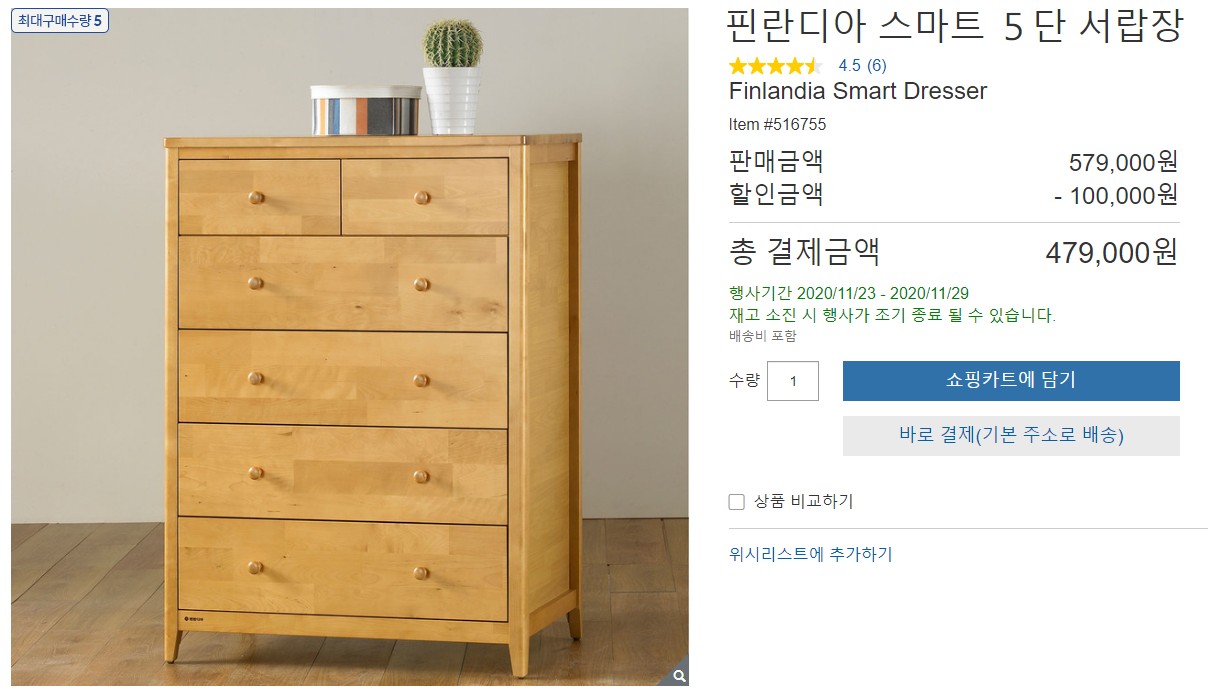 핀란디아 스마트 5단 서랍장은 코스트코 블랙 프라이데이 할인 10만원에 즉시할인 2만원 총 12만원 할인이 적용됩니다