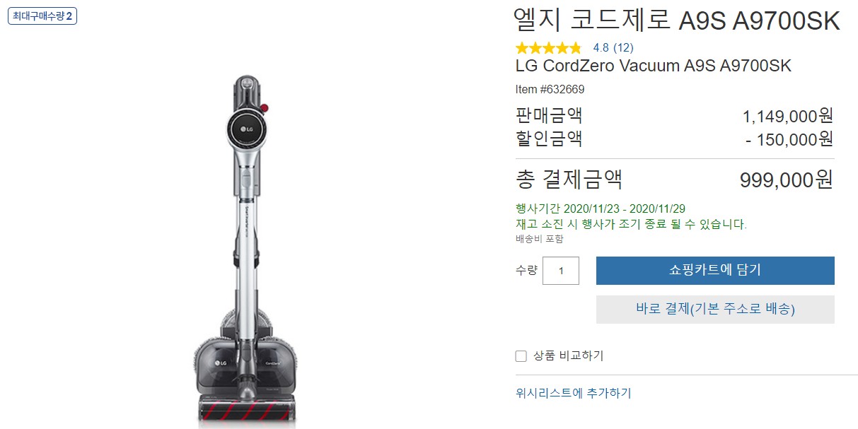 엘지 코드제로 청소기는 15만원 할인에 즉시할인 2만원 총 17만원 할인이 적용되 979,000원에 구매가 가능합니다