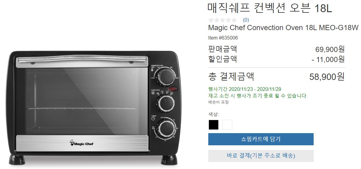 매직쉐프 컨벡션 오븐 18L 제품은 코스트코 블랙 프라이데이 세일 기간중 11,000원 할인을 받으실 수 있습니다