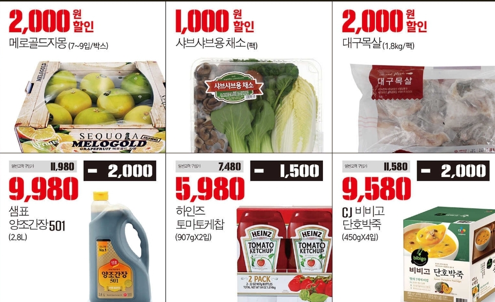 메로골드자몽, 샤브샤브용 채소, 대구목살, 샘표양조간장, 하인즈 토마토케찹, cj비비고 단호박죽이 할인 행사 중에 있습니다