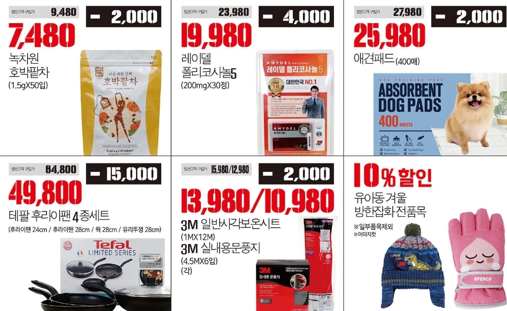 녹차원 호박팥차, 레이델 폴리코사놀, 애견패드, 테팔 후라이팬 4종세트, 3m 문풍지, 유아동 겨울 방한잡화 전품목 10프로 할인 중 입니다