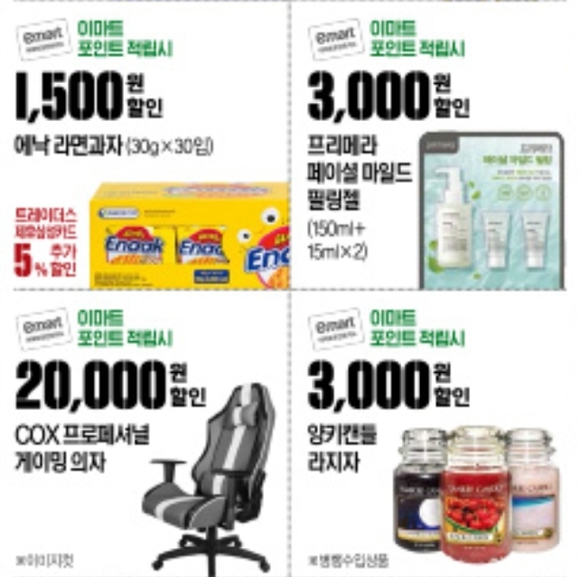 에낙 라면과자, 프리메라 페이셜 마일드 필링젤, 게이밍의자, 양키캔들 할인 판매 합니다