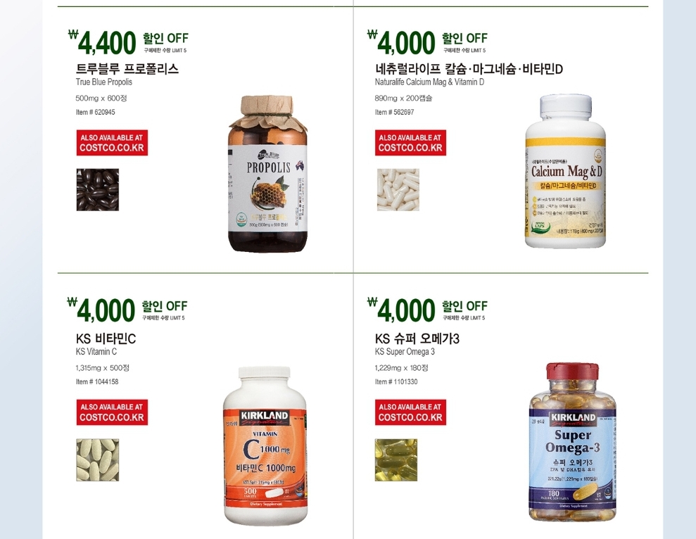 트루블루 프로폴리스, 네추럴라이프 칼슘/마그네슘/비타민D, 커클랜드 비타민C, 커클랜드 오메가3도 할인 판매 합니다