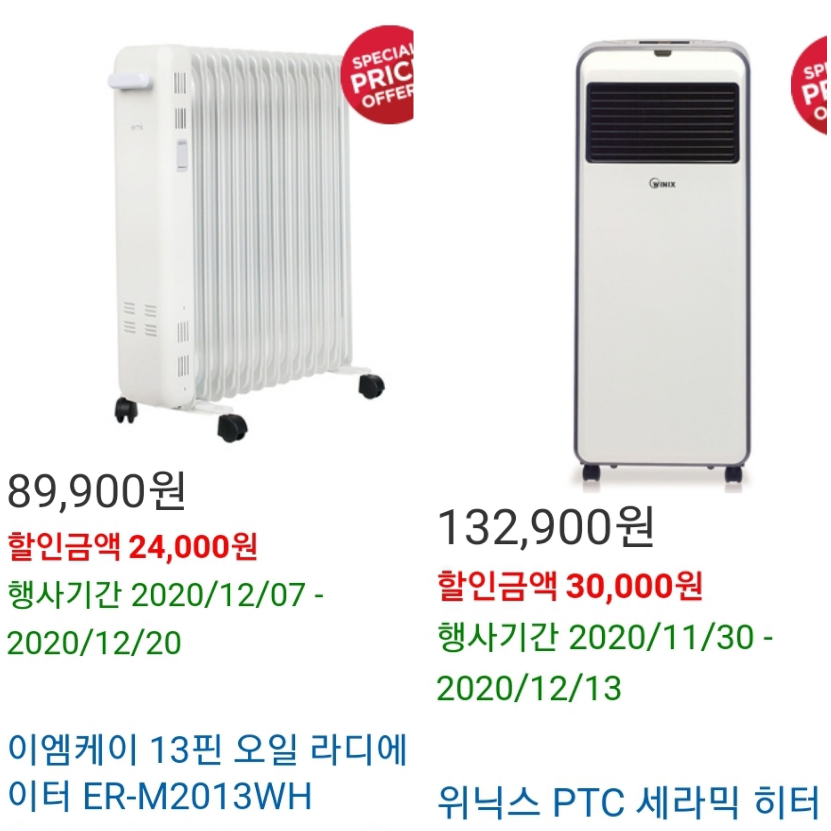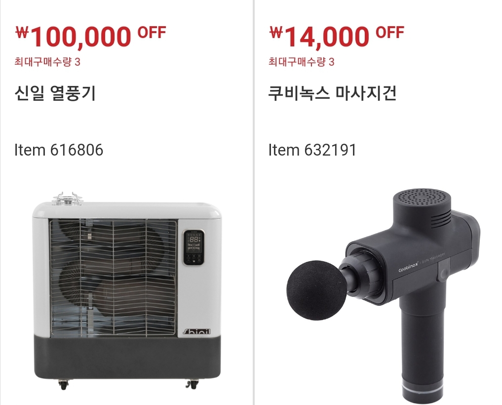 먼저 신일 열풍기, 쿠비녹스 마사지건 할인을 진행합니다
