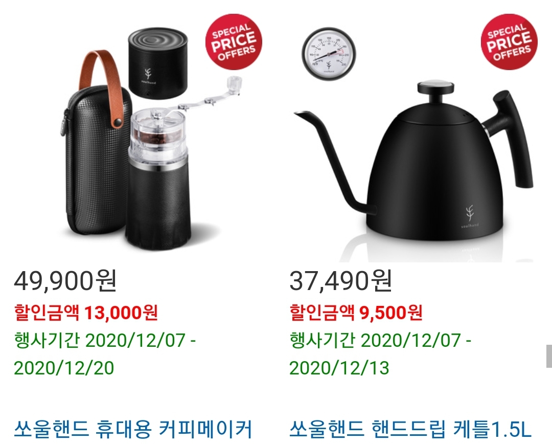 다음은 휴대용 커피메이커와 핸드드립 케들 할인 품목 입니다