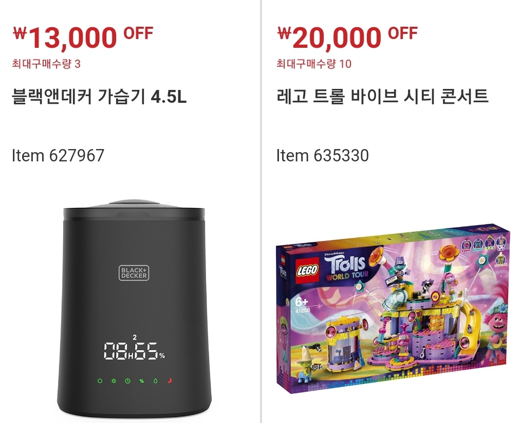 블랙앤데커 가습기, 레고 트롤 바이브 시티 콘서트 제품도 할인 쿠폰 대상입니다