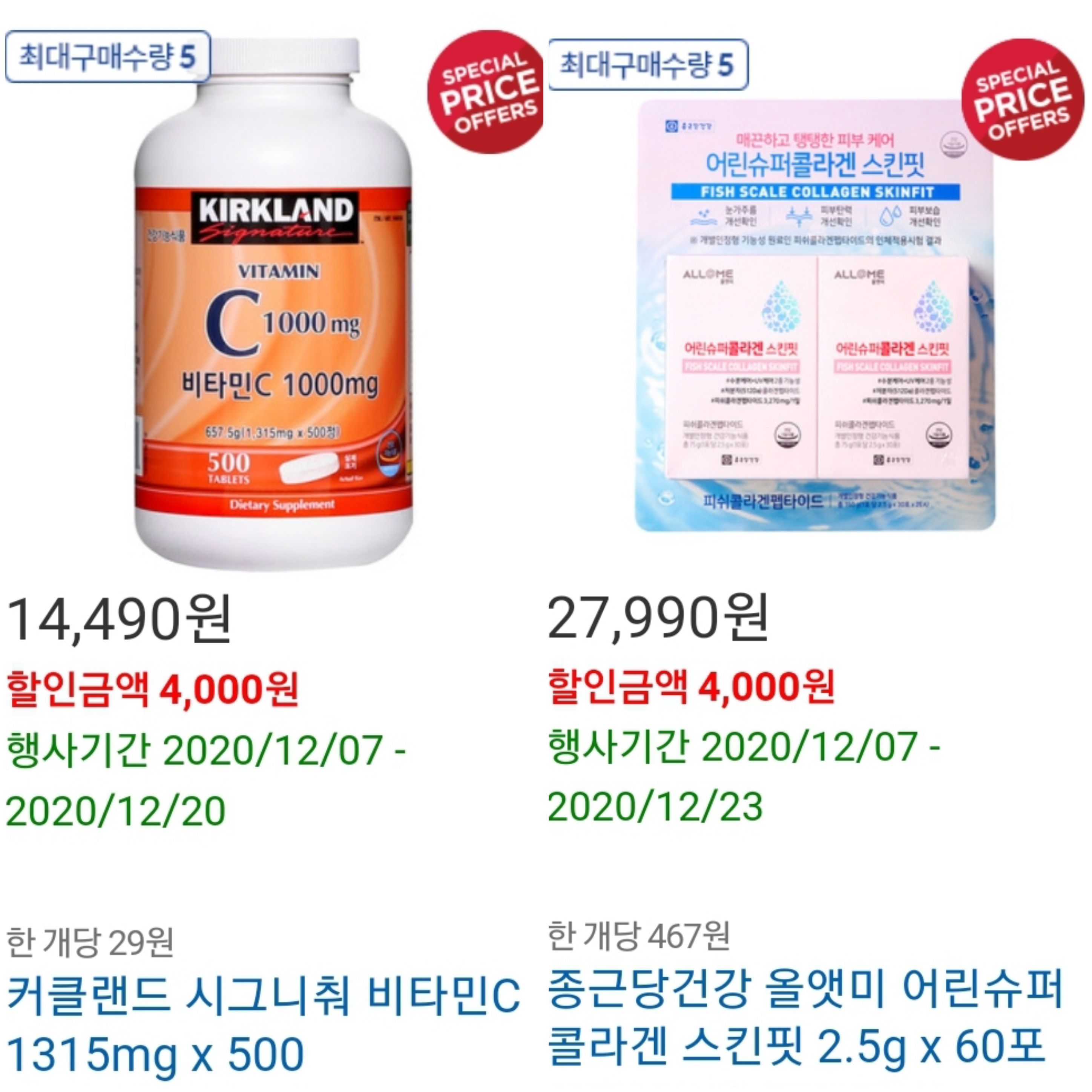커클랜드 비타민C와 종근당 어린슈퍼콜라겐 스킨핏 할인 판매합니다