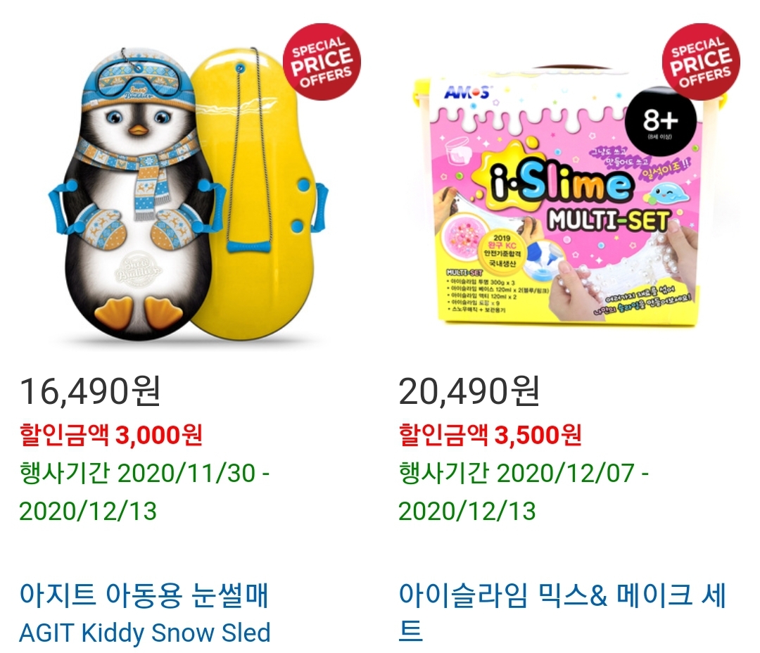 눈썰매와 아이슬라임도 할인 판매 합니다
