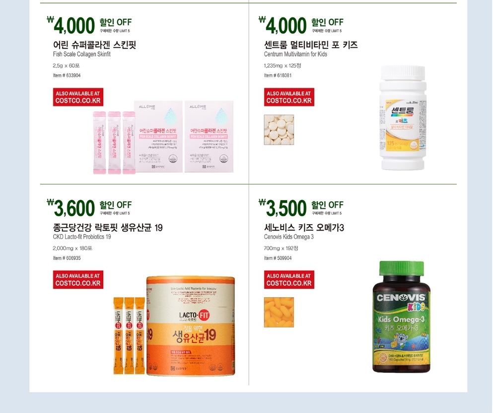 멀티비타민의 대표 센트룸에서 센트룸 멀티비타민 포 키즈 제품을 할인 판매합니다 그리고 요즘 가장 잘팔리는 유산균중 하나인 종근당 건강 락토핏 생유산균 제품도 할인 판매합니다 세노비스 키즈 오메가3, 어린 슈퍼콜라겐 스킨핏도 할인 판매를 하고 있으니 자녀가 있으신 분들은 이번 기회에 어린이용 영양제 구입을 고려해보셔도 좋을 것 같습니다