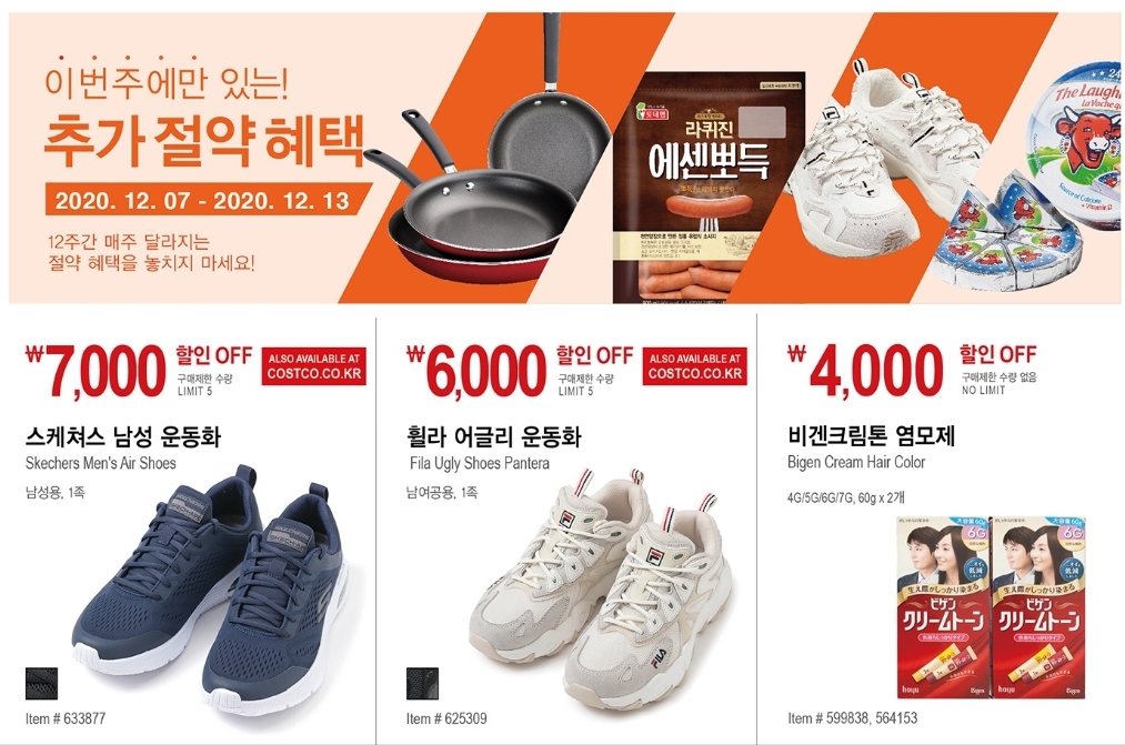 코스트코 12월 둘째주 할인 상품으로 스케쳐스 남성 운동화, 휠라 어글리 운동화, 비게크림톤 염모제가 할인 판매될 예정입니다