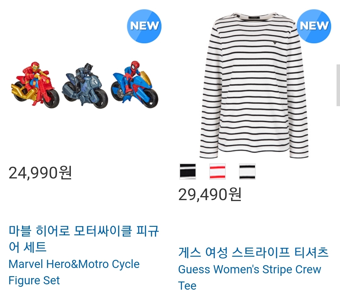 마블 히어로 모터싸이클 피규어세트, 게스 여성 스트라이프 티셔츠가 추가되었습니다