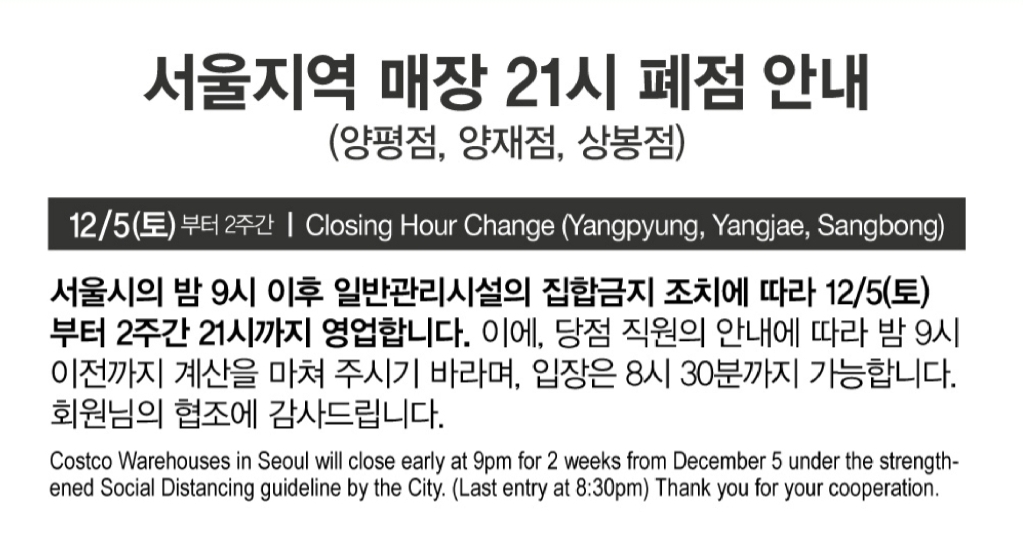 그래서 서울 코스트코 매장인 양평점, 양재점, 상봉점은 12월 5일 토요이루터 2주간 21시까지만 운영합니다