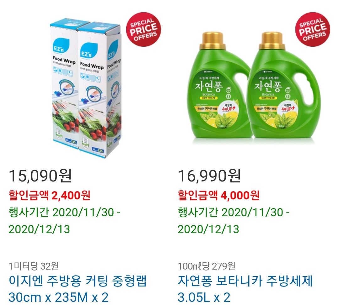 커팅된 주방랩 중형사이즈와 자연퐁 주방세제도 코스트코 12월 둘째주 할인 품목 입니다